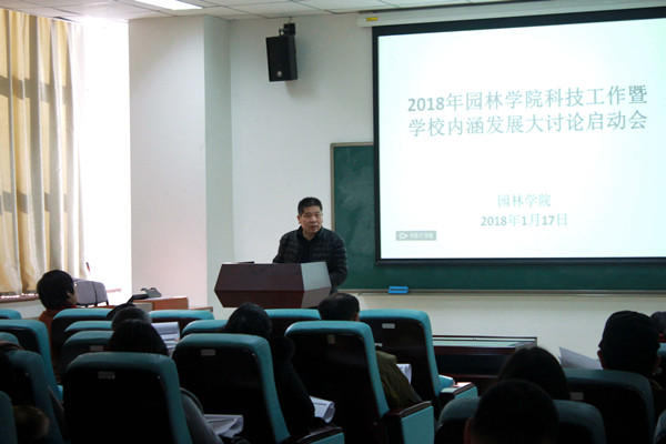 基于学校内涵发展大讨论的整体安排,以及本周一科技处组织召开的科研工作会的要求,2018年1月17日下午2:00,红足一1世在园林楼101召开了2018年红足一1世科技工作暨学校内涵发展大讨论启动会。学院的主要骨干教师参加了会议,院长张克中做了科研工作报告,会议由科研副院长付军主持。