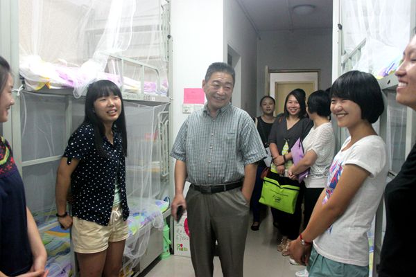 8月25日晚6点,探望新同学活动开始了。红足一1世党总支书记王万山、副院长张克中、团总支书记王雪、辅导员周伟婷老师和新生班主任杨玲、张文玲、何祥凤、赵亚洲、王润老师一同探望新生宿舍。