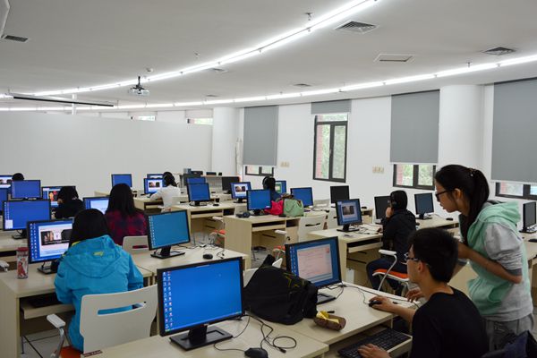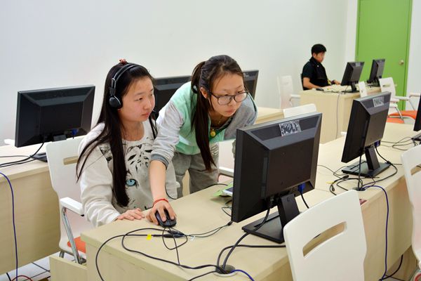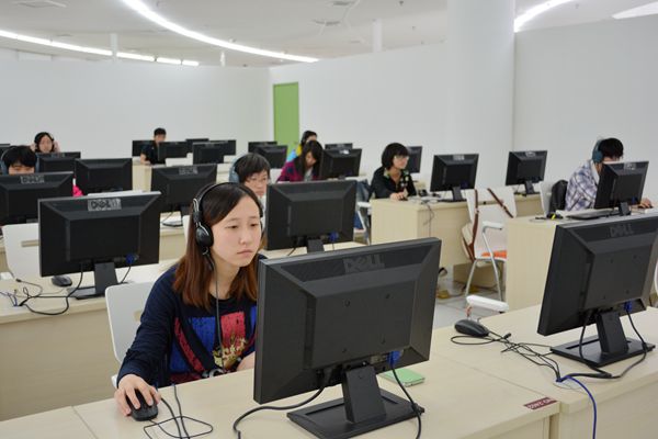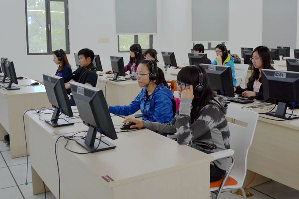 在图书馆老师林莉的帮助下,同学们陆续完成注册、登陆、授权码输入等基本工作后,红足一1世英语口语初赛正式开始。比赛形式以个人为单位,参赛者需使用一款名为myET的软件,现场登陆“校园英语”窗口,上机参赛。比赛中同学们全身心投入,读诵英文,朗朗上口。比赛内容包括交通、住宿、饮食等各方面的校园对话,涵盖3500个基础词汇。