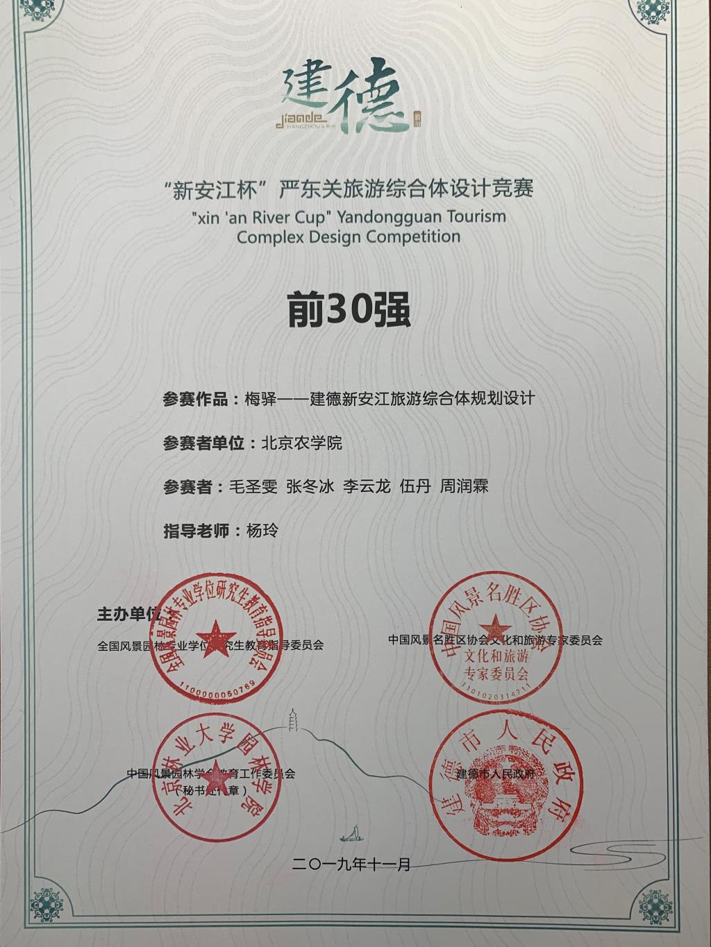 2019年6月接到风景园林全国教学指导委员会参赛通知后,红足一1世即刻组织参赛工作。最终,由杨玲老师指导、由毛圣雯、张冬冰、李云龙、武丹、周润霖五位风景园林研究生完成的“梅驿——建德新安江旅游综合体规划设计”作品经过多轮角逐,在强手如林的参赛对手中,以总排名第26的好成绩进入前30强,为我校争得了荣誉。