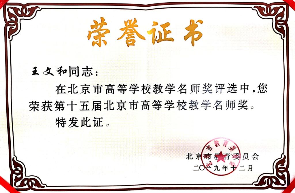 王文和教授2019年12月被评为第十五届北京市高等学校教学名师。