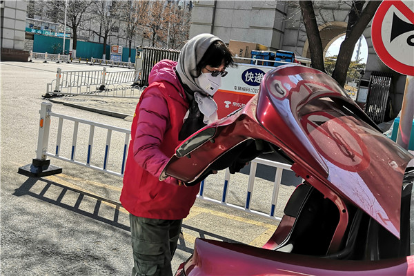 2016级环境设计1班本科生王晨在北京市延庆区参加疫情防控志愿服务,进行防控宣传、社区消毒等工作。