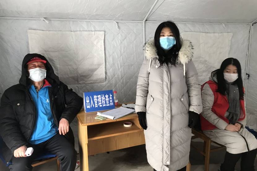 2017级林学2班本科生刘鑫格(图中左二)参加北京市平谷区建设西街疫情防控志愿服务,对社区出入口进行检查。