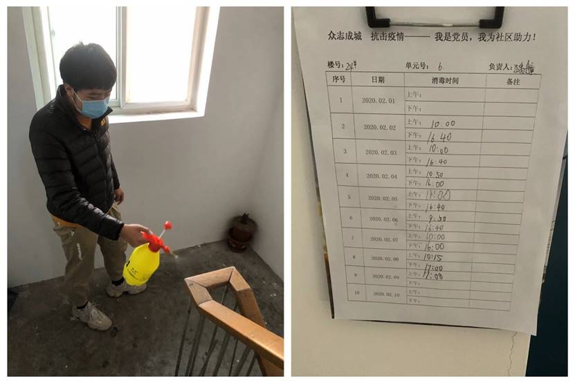 2019级风景园林2班本科生江禹艟参加北京市大兴区观音寺北理社区楼道消毒工作。