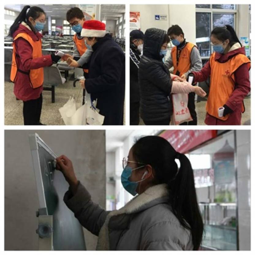 2018级林学2班本科生王加升(图中左一)参加北京农学院第一食堂疫情防控志愿服务,在食堂入口处对师生量测体温、维持秩序、引导师生就餐,并为隔离观察的师生送餐。