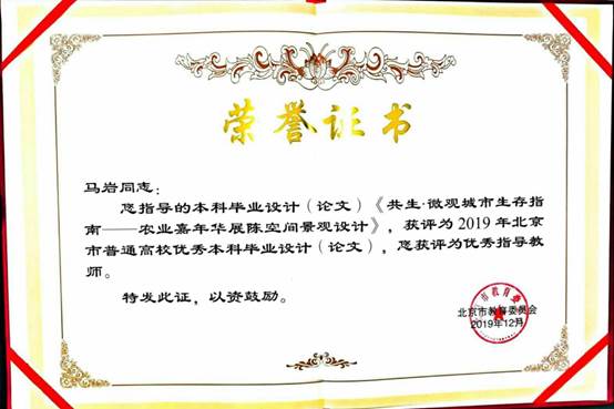 本科生毕业设计《共生·微观城市生存指南——农业嘉年华展陈空间景观设计》被评为2019年北京市普通高校优秀本科毕业设计。指导教师马岩副教授被评为优秀指导教师。